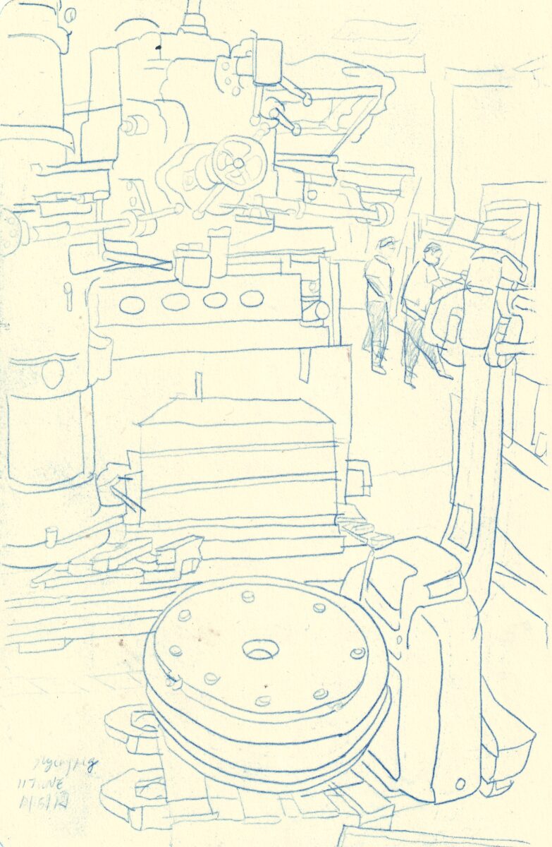 Later that same day in the Bogie Team, I sketched my second drawing. While chatting with the sifus (masters), I asked which spot in the workshop was their favourite. As we talked, I suddenly realised that the Machining Team was actually right next door to them.